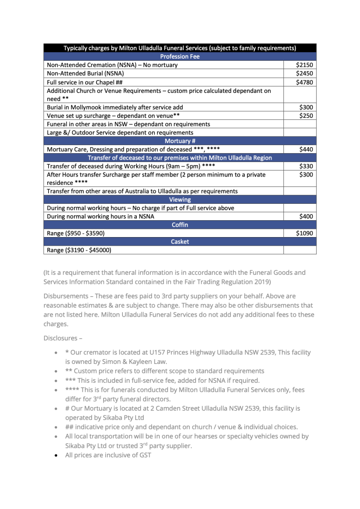 All pricing displayed are for funerals conducted by Milton Ulladulla Funeral Services only.